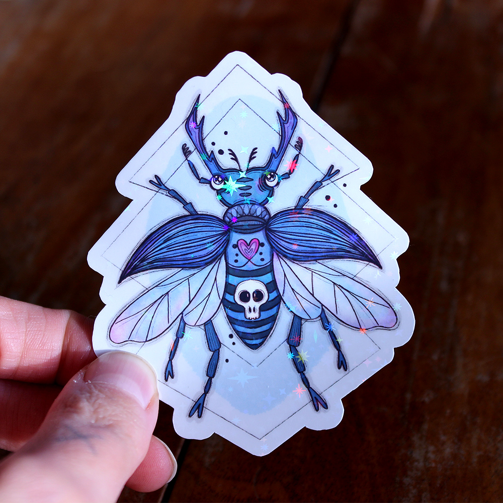 Die Aufkleber sind selbst gedruckt und von Hand mit der holographischen Folie beklebt, daher ist jeder Aufkleber ein kleines bisschen anders. Die Farbe kann etwas abweichen aufgrund von Bildschirmeinstellungen und Lichtverhältnissen.